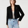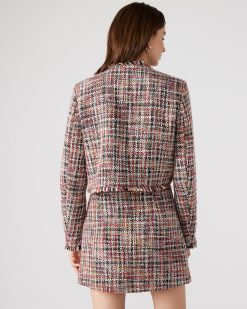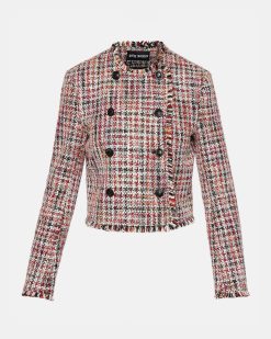 Introducing the ANTOINETTE – a stylish collarless tweed blazer that exudes sophistication. The fray hem detail trim adds a touch of elegance. while the double-breasted design is adorned with an animal crest button for a unique touch. With shoulder pads and a fully lined interior. this jacket looks great and provides a comfortable fit. Elevate your wardrobe with this must-have piece.