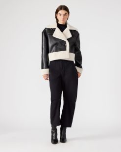 Expertly crafted. the ATHEN is a timeless piece that offers both style and functionality. Its double-breasted design adds an elegant touch. while the boxy oversized fit and cropped length provide a modern twist. The faux shearling trim not only adds texture but also provides warmth. The functional collar belt and stabilizing buttons make this jacket a practical choice for any occasion.