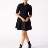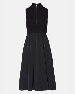 The BERLIN is a versatile and chic addition to any wardrobe. With a stylish combination of a sleeveless knit top and a nylon a-line skirt. this midi length dress is both comfortable and fashionable. Perfect for spring. it features a zip front. mock neck. and snap pockets for added functionality. Elevate your style with this midi dress.