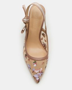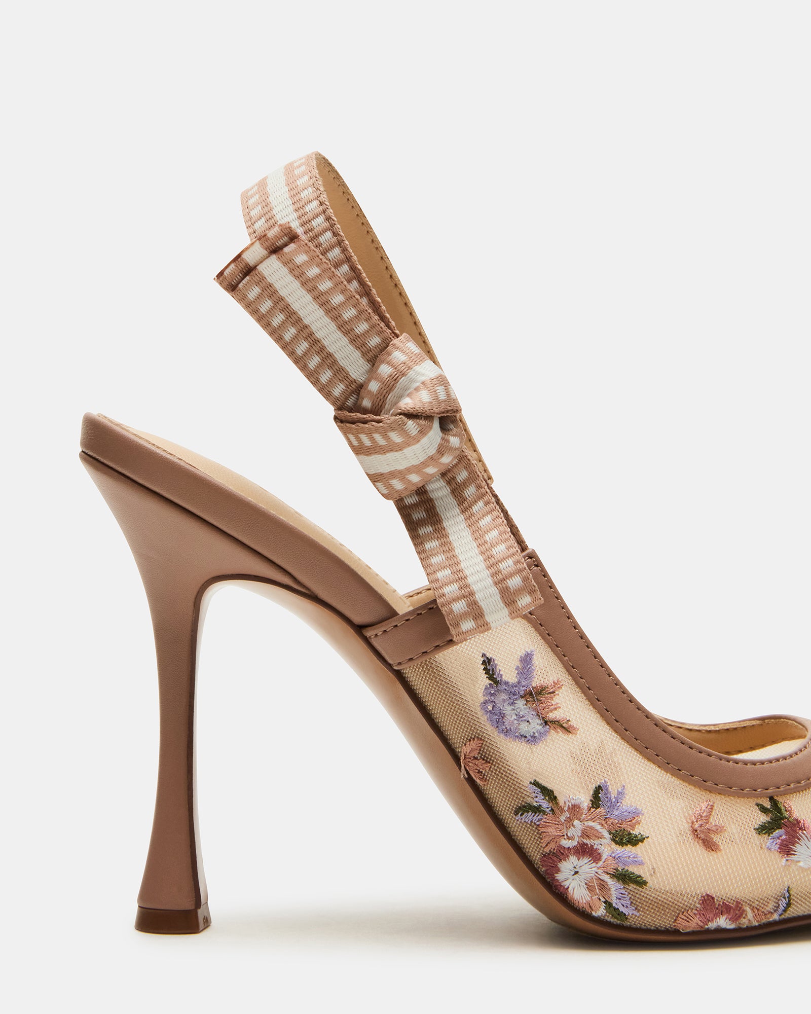 A grosgrain ribbon wraps around the slingback strap of the BRI point toe stiletto and finishes with a bow accenting the side of the shoe.