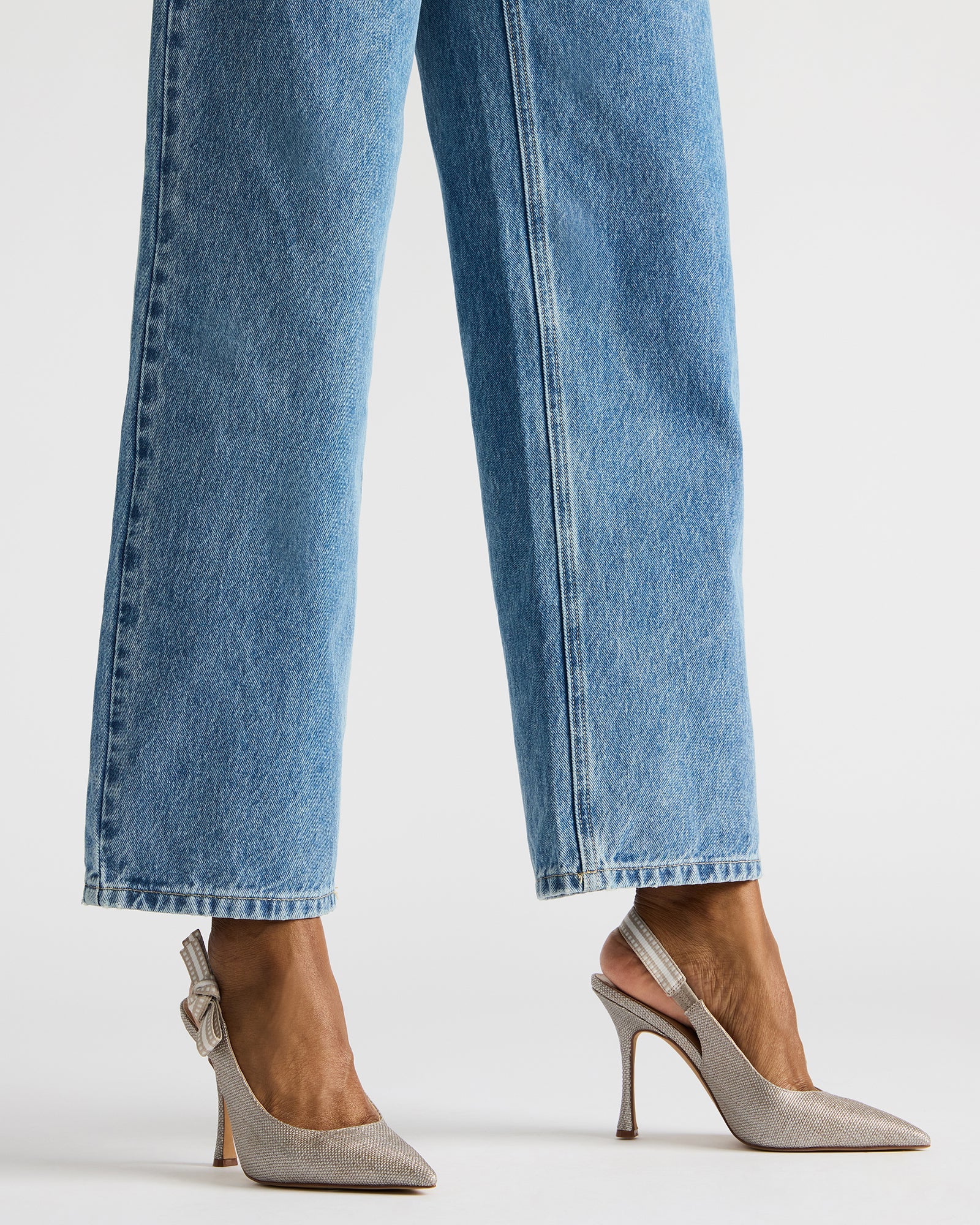 A grosgrain ribbon wraps around the slingback strap of the BRI point toe stiletto and finishes with a bow accenting the side of the shoe.