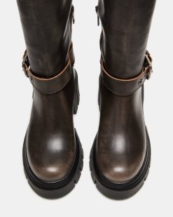 These BRIGADE feature a unique moto design and buckle details. making them a stylish choice for any outfit. With a lug knee-high fit. these boots provide both fashion and function. The perfect addition to any wardrobe for a trendy. edgy look.