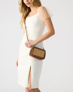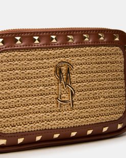 Expertly crafted with stylish pyramid stud detailing. this DAISYS bag is a must-have for any fashion-forward individual. This straw crossbody bag features a top-zipper closure with multiple gussets. ensuring your belongings stay secure. With integrated back and front wall pouches and a durable chain curb crossbody strap. this bag offers both practicality and style.