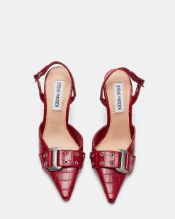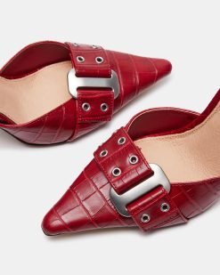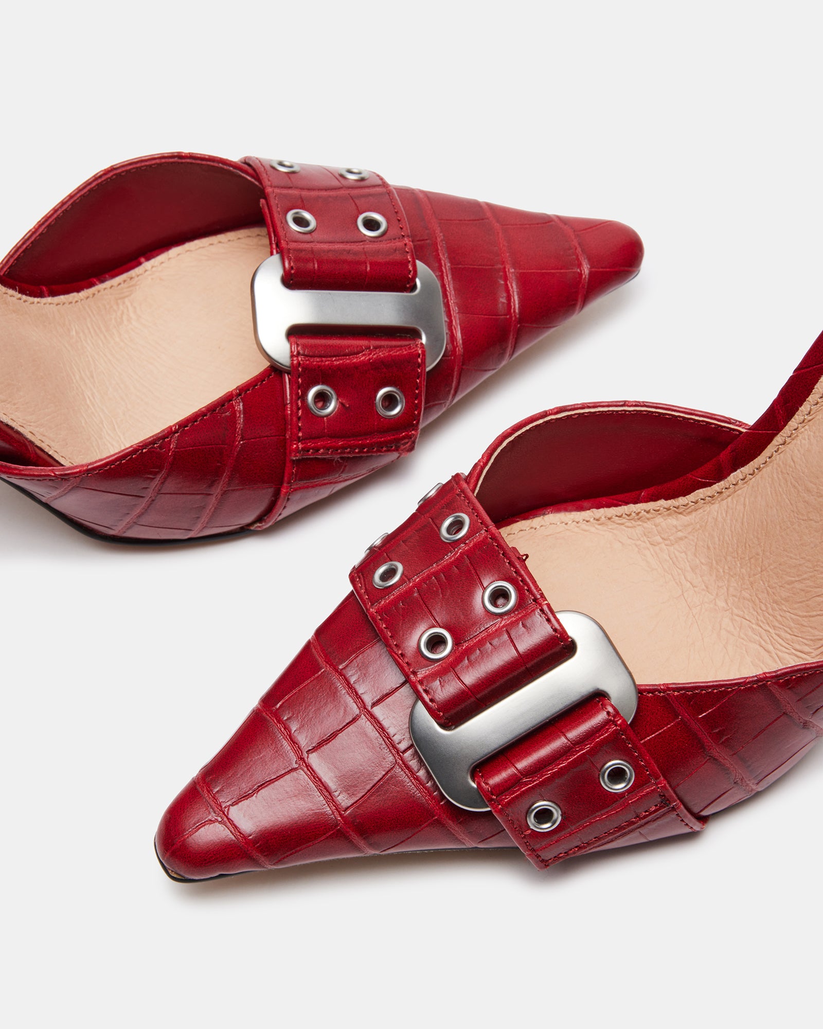 The DILLON pump features a point toe silhouette accented with chunky buckle hardware.