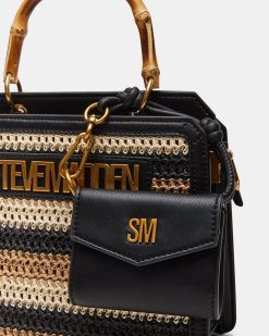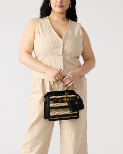 Expertly crafted from straw materials. the EVELYN BEACHY bamboo top-handle bag combines style and functionality. Its structured design features multiple compartments and a zipper closure for easy organization. while the removable snap closure mini bag charm adds a touch of personality. With a detachable crossbody strap. this bag is versatile and perfect for everyday use.