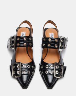 The GRAYA slingback have an angular silhouette with a square back and a snipped toe. Chunky grommets and oversized buckles give an edge to the wide straps over the top and the toe of this design.