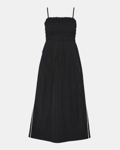Expertly designed for comfort and style. the KIT is the perfect addition to your wardrobe. The flowy maxi dress features sleek stripe detailing. while the pull-on style and adjustable straps provide a customizable fit. The smocked top adds a touch of flair and versatility to this must-have piece.