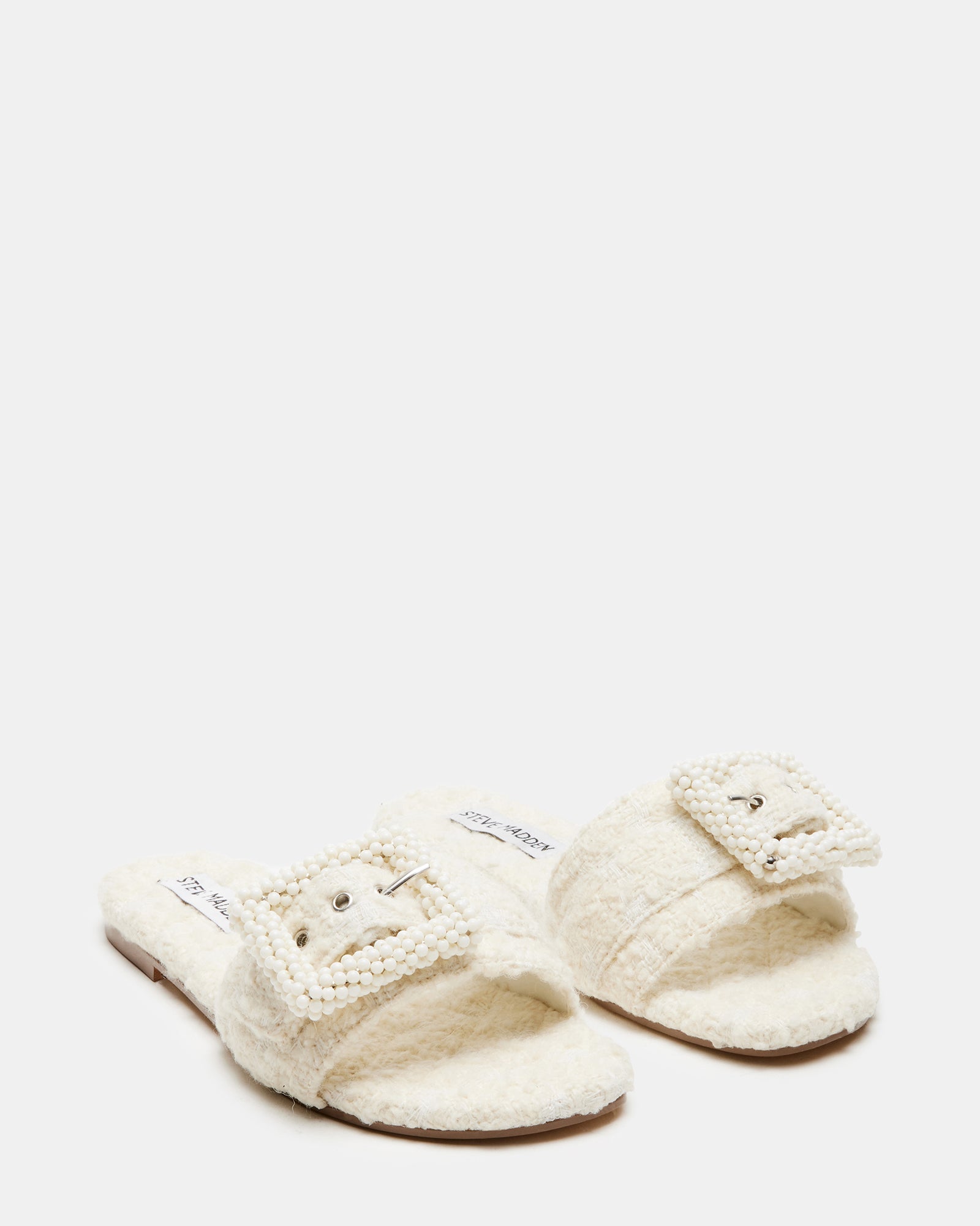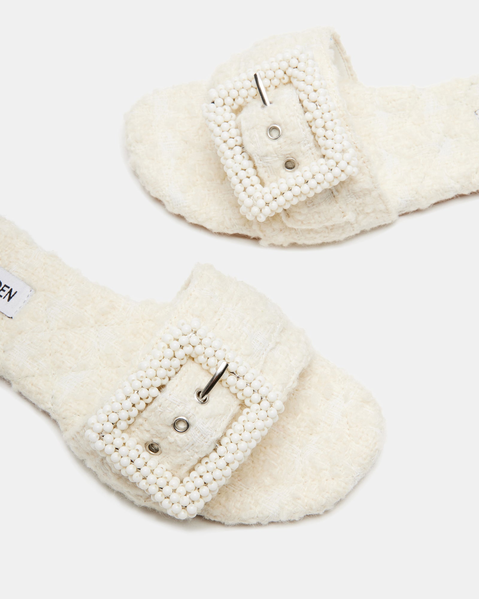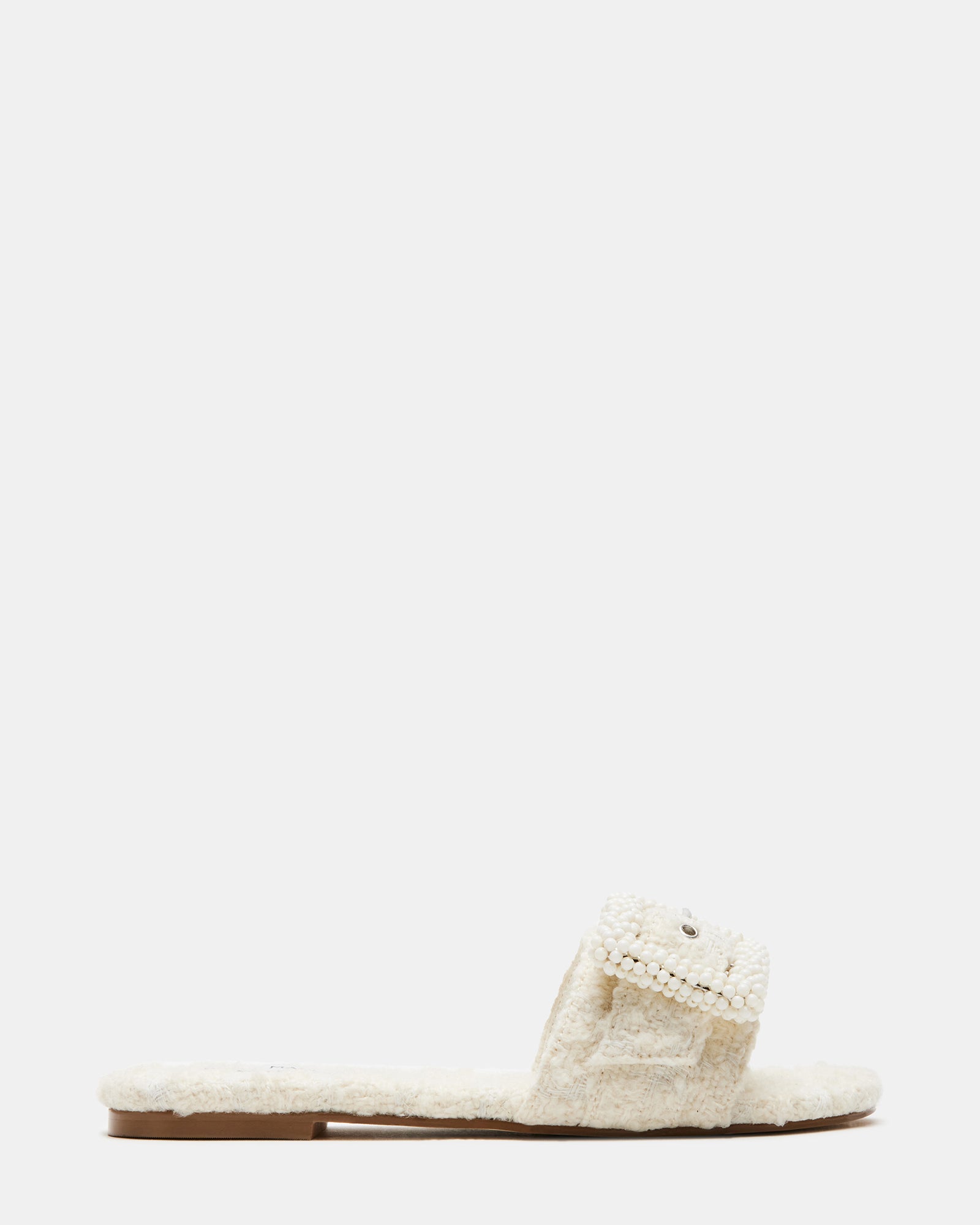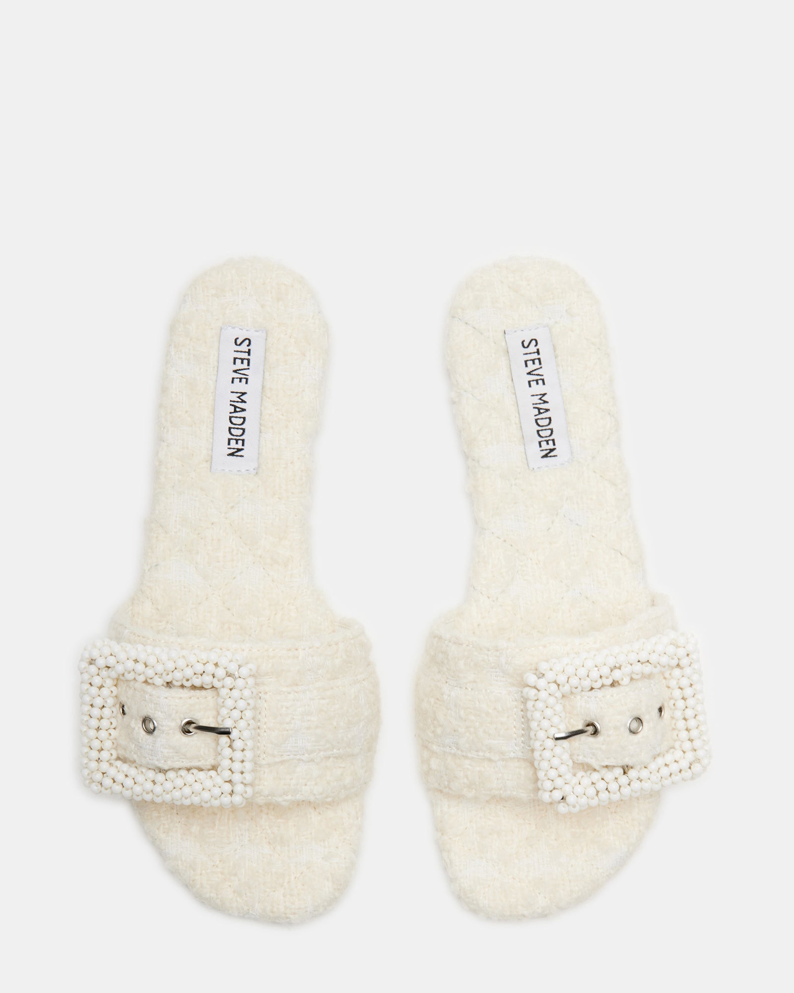 A chunky rhinestone buckle on the strap of the MARIKA adds a moment of sparkle to an easy flat look.