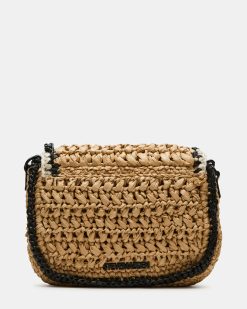 Introducing the MAR bag. a stylish and practical straw crossbody bag. It features a front flap with hidden push-lock closure. an interior front wall and pouch back wall. and a convenient chain crossbody strap. Stay organized and fashion-forward with this must-have accessory.