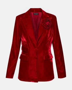 This elegant MERENE features a button-up closure. long-sleeves. and two functional front pockets. making it both stylish and functional. The rose decal and velvet material adds a touch of sophistication. making it the perfect statement piece for any professional or formal event.