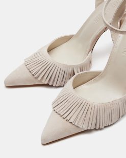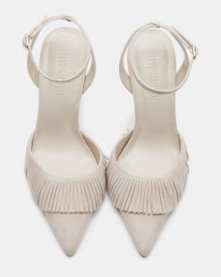 Expertly crafted and designed for sophistication. the QUALLEY features a pointed-toe with a crisscross back and ankle strap for added support. Its pump design and fringe detailing add a touch of luxury to any look. Elevate your wardrobe with these must-have heels.