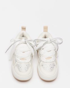 Layered texture gives the ROARING White Rhinestones their signature look. with a wider set of laces crossed over the first set using cutout panels along the sides of the shoe. Rhinestone embellishment finishes the design with a touch of sparkle.