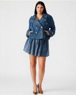 Enhance your wardrobe with the SIRUS denim . This cropped trench boasts a double-breasted design and features two functional side pockets. The two wind flaps provide added functionality while the shoulder epaulettes and sleeve cuff belts add a touch of style. Complete with a pleated back flap. this jacket is both practical and chic.