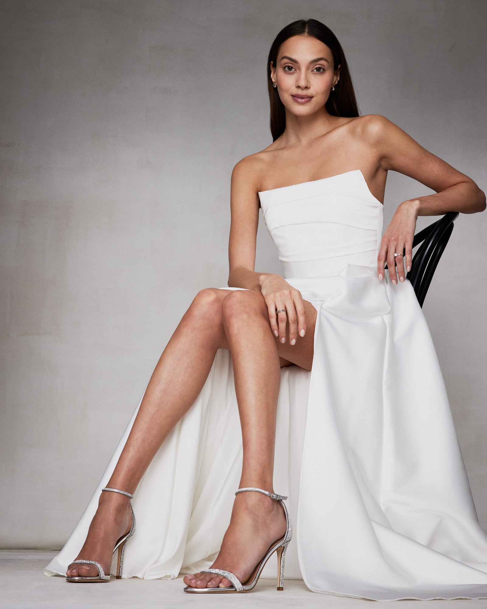 2 slender straps secure the TECY sandal to its stiletto heel for a minimalist take on the classic strappy high sandal. This super sparkly version sets the straps and heel with mini rhinestones for an iced-out update.
