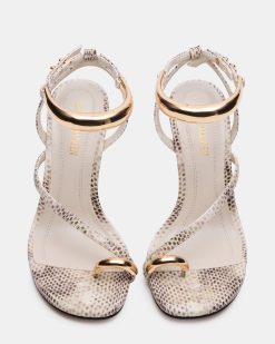 Step into style with the TIA stiletto . With daring gold hardware accents and a strappy design. this shoe will elevate any outfit. Unleash your boldness and conquer the day in these statement heels!