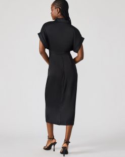 The TORI has a rolled collar and cuffed short sleeves. with an adjustable gathered tie-front waist and a high-low hem. The dress is finished with a washed satin texture. giving it a polished look.