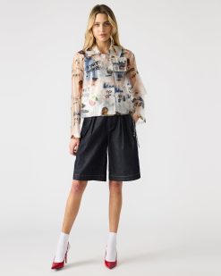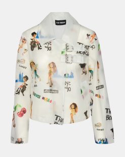 Introducing the TOVE . This long-sleeved transparent jacket features unique multi-colored graphic designs. perfect for making a bold statement. Stay stylish and practical with its functional front pockets. and complete the look with the classic collared neckline. Expertly crafted for the fashion-forward individual.