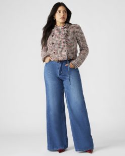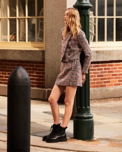 Introducing the ANTOINETTE – a stylish collarless tweed blazer that exudes sophistication. The fray hem detail trim adds a touch of elegance. while the double-breasted design is adorned with an animal crest button for a unique touch. With shoulder pads and a fully lined interior. this jacket looks great and provides a comfortable fit. Elevate your wardrobe with this must-have piece.