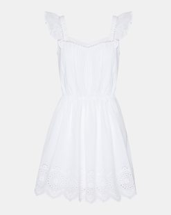 Elevate your spring wardrobe with the ASTRA . This eyelet cotton voile mini dress features charming ruffle trim straps and delicate lace details. With an elastic waist and scalloped hem. this dress offers a comfortable fit and a cottagecore style. Perfect for any occasion. this dress is the epitome of spring country charm.