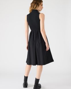 The BERLIN is a versatile and chic addition to any wardrobe. With a stylish combination of a sleeveless knit top and a nylon a-line skirt. this midi length dress is both comfortable and fashionable. Perfect for spring. it features a zip front. mock neck. and snap pockets for added functionality. Elevate your style with this midi dress.