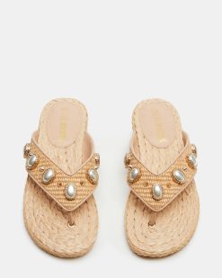 Expertly crafted from raffia materials. these CADENZA feature a chic flat thong design adorned with delicate pearl embellishments. Embrace effortless style and comfort with these summer-ready sandals.