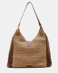 A boho styling moment! Expertly crafted with a beautifully unique western buckle mag snap closure and fringe detailing. the COLTIE bag is essential for any trendy boho individual. Featuring a 16 handle drop. this bag offers exceptional comfort for extended use. The interior pouch back wall and shoulder strap tote design add convenience and functionality for everyday use. Made with a durable straw material. this slouchy hobo bag exudes both style and substance.