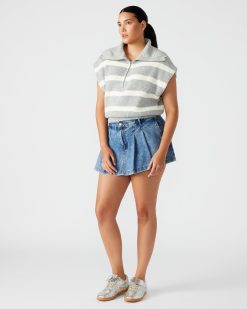 Stay stylish with the EASTON Its hooded sleeveless design. stripe pattern. and wide collar offer both comfort and fashion. The half-zipper metal closure adds a touch of practicality. while the relaxed fit guarantees a flattering look. Perfect for days on the go.