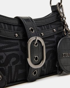 The MOTORR bag combines Y2K-inspired logo print with vintage buckle detailing for a distinctive look. Designed with both style and function in mind. it features a magnetic snap and top-zipper closure to secure your essentials. Its spacious interior comfortably fits a large phone and includes front and back wall pockets for organized storage. An attachable mirror bag charm adds a practical. stylish touch. making this shoulder bag a versatile accessory for everyday use.