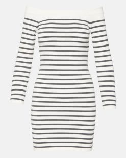 The NOA sweater is a mini off-the-shoulder dress with a bodycon fit and 3/4 length sleeves. Designed with a chic black and white striped pattern. this dress is perfect for a night out or a casual day look. Its bodycon fit accentuates your curves while the off-the-shoulder style adds a touch of sophistication. Stay stylish and comfortable with this versatile dress.
