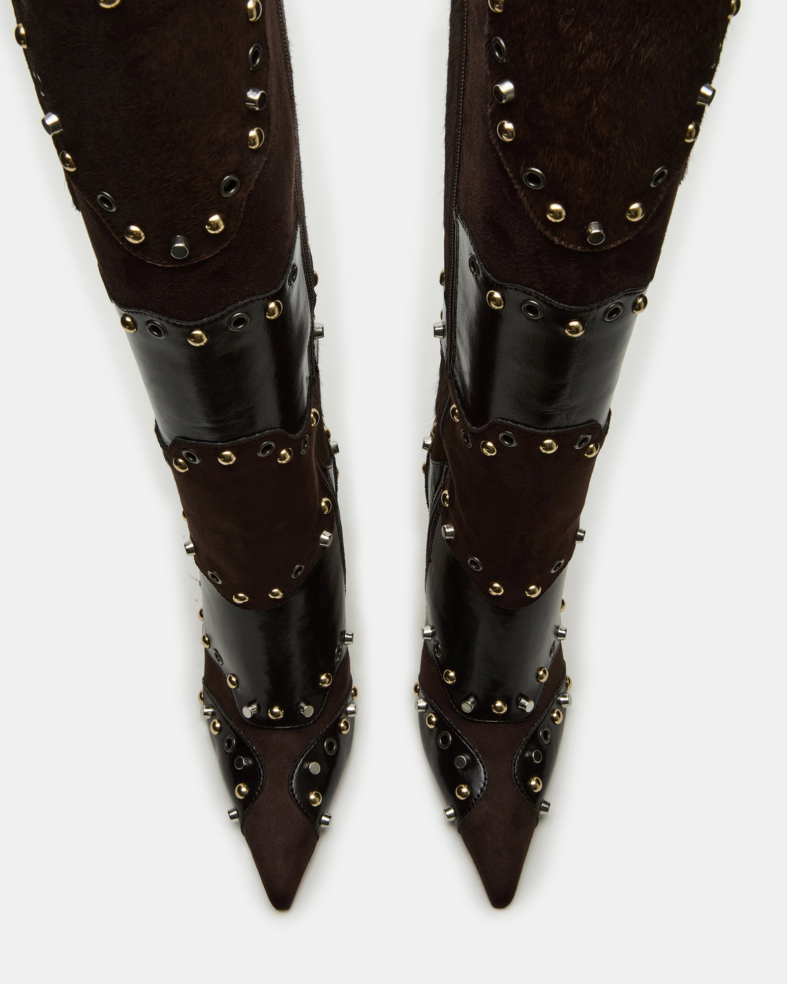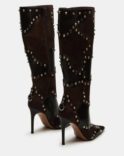 Elevate your style with the REVIVE. a knee-high stiletto featuring a pointed-toe and distinctive studded detailing. Crafted for a sleek. confident look. this boot combines edgy accents with a refined silhouette. perfect for making a bold statement while maintaining elegance. Ideal for fashion-forward wearers seeking both sophistication and attitude in their footwear.