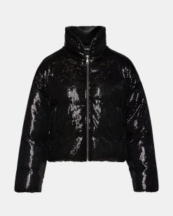 This STRATTO sequin puffer features a zipper closure and long sleeves. The stylish design and high-quality materials provide both warmth and fashion-forward appeal. With a flattering fit and versatile design. this jacket is a must-have for any fashion enthusiast.