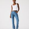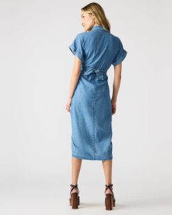 The TORI has a rolled collar and cuffed short sleeves. with an adjustable gathered tie-front waist and a high-low hem. The dress is finished with a denim fabric texture. giving it a polished look.