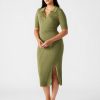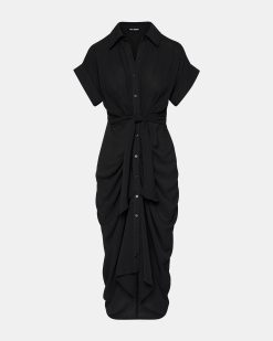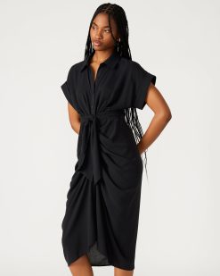 The TORI has a rolled collar and cuffed short sleeves. with an adjustable gathered tie-front waist and a high-low hem. The dress is finished with a lightweight woven crepe fabric. giving it a polished look.